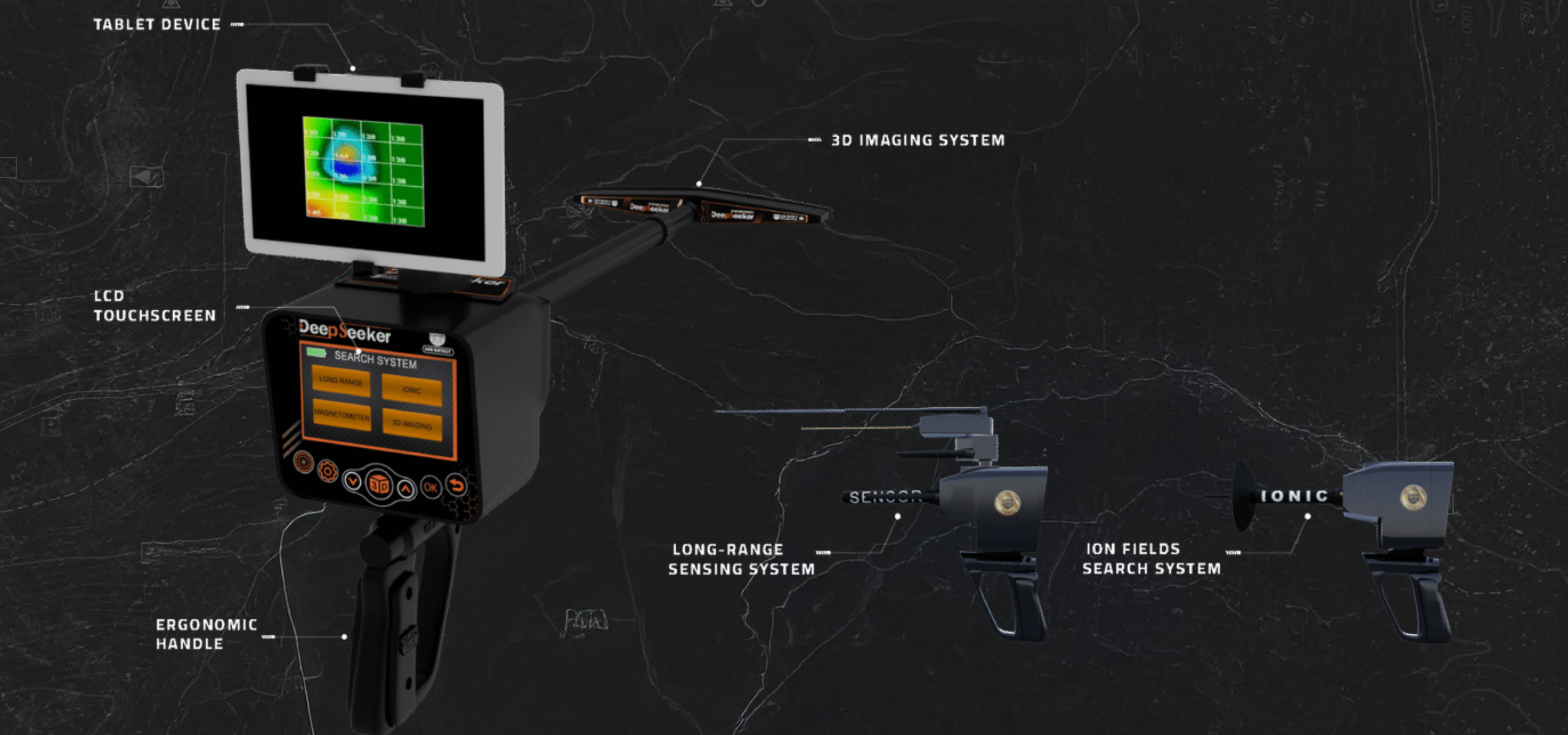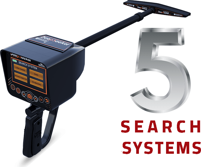 A complete 5 search systems station in one device, specialized in detection of underground gold, treasures, ancient antiquities, voids, caves, and tombs